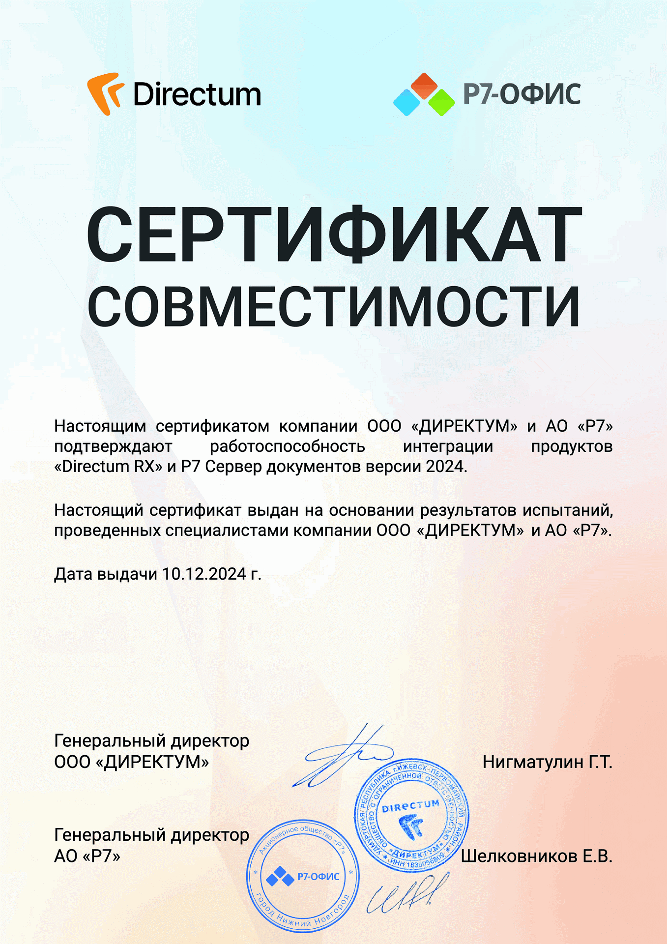 Команды отечественных разработчиков «Р7» и Directum подтвердили совместимость интеллектуальной ECM/BPM-системы Directum RX версии 4.11 с новой версией кроссплатформенного пакета офисных приложений «Р7-Офис» версии 2024.3.2.622.